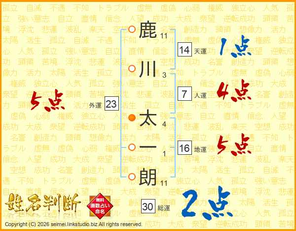 鹿(11画)川(3画) 太(4画)一(1画)朗(11画)