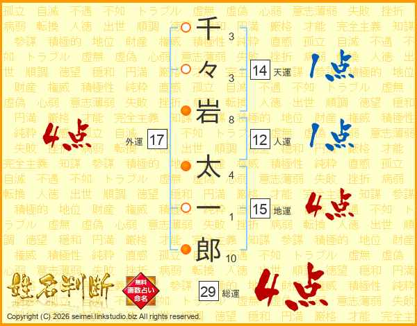 千(3画)々(3画)岩(8画) 太(4画)一(1画)郎(10画)