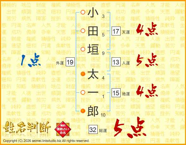 小(3画)田(5画)垣(9画) 太(4画)一(1画)郎(10画)