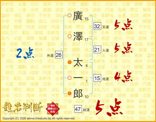 廣(15画)澤(17画) 太(4画)一(1画)郎(10画)