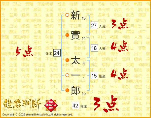 新(13画)實(14画) 太(4画)一(1画)郎(10画)