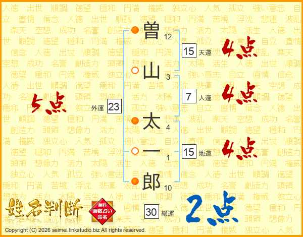 曽(12画)山(3画) 太(4画)一(1画)郎(10画)