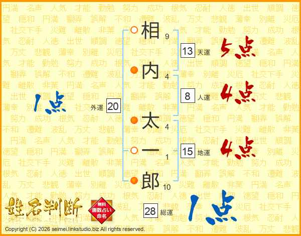 相(9画)内(4画) 太(4画)一(1画)郎(10画)