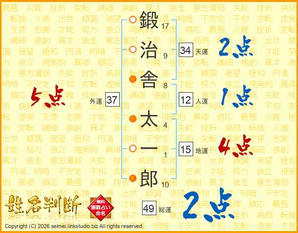 鍛(17画)治(9画)舎(8画) 太(4画)一(1画)郎(10画)