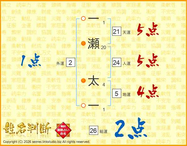 一瀬太一さんの総運は26画の2点!