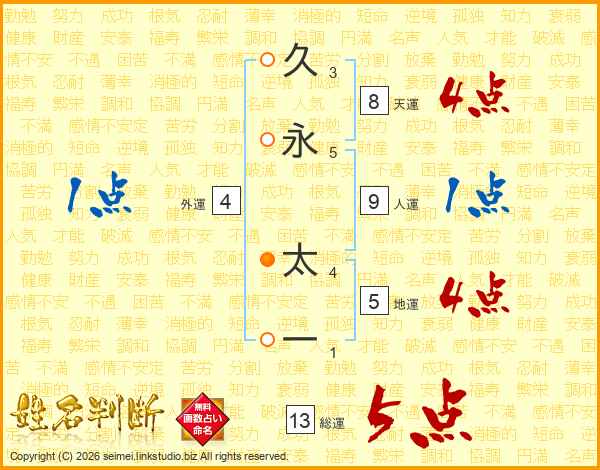 生活面を象徴する運勢です。外部から受ける影響力を表し、結婚運、家庭運や職場、環境への順応性を表します。総運から人運を引いた画数。姓や名が1文字の場合を除く。
