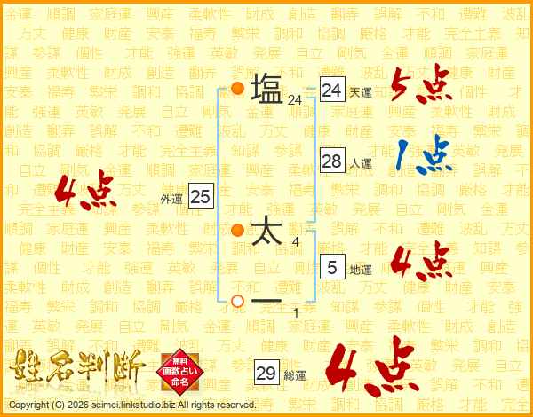 生活面を象徴する運勢です。外部から受ける影響力を表し、結婚運、家庭運や職場、環境への順応性を表します。総運から人運を引いた画数。姓や名が1文字の場合を除く。