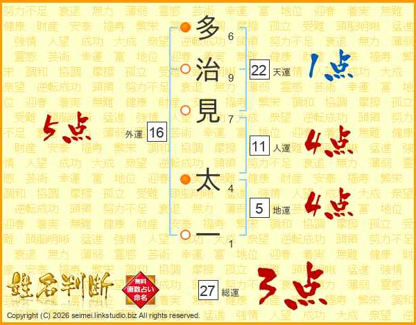 多(6画)治(9画)見(7画) 太(4画)一(1画)