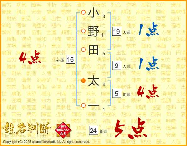 小(3画)野(11画)田(5画) 太(4画)一(1画)