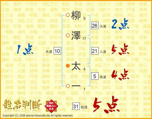 柳澤太一さんの天運は26画の2点!