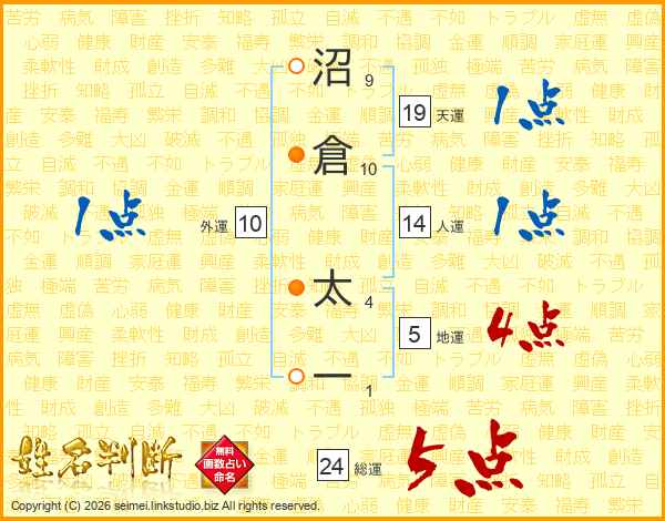 生活面を象徴する運勢です。外部から受ける影響力を表し、結婚運、家庭運や職場、環境への順応性を表します。総運から人運を引いた画数。姓や名が1文字の場合を除く。