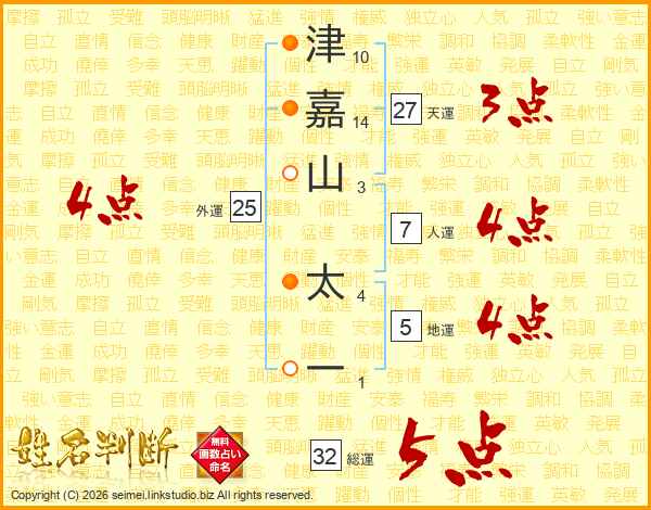 津(10画)嘉(14画)山(3画) 太(4画)一(1画)