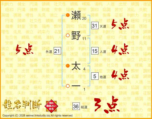 瀬野太一さんの外運は21画の5点!