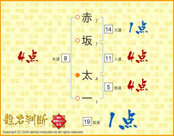 生活面を象徴する運勢です。外部から受ける影響力を表し、結婚運、家庭運や職場、環境への順応性を表します。総運から人運を引いた画数。姓や名が1文字の場合を除く。