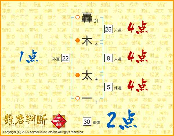 生活面を象徴する運勢です。外部から受ける影響力を表し、結婚運、家庭運や職場、環境への順応性を表します。総運から人運を引いた画数。姓や名が1文字の場合を除く。
