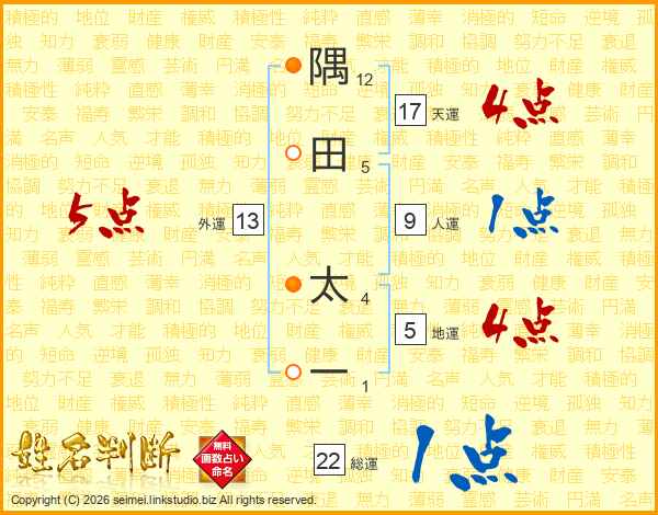 生活面を象徴する運勢です。外部から受ける影響力を表し、結婚運、家庭運や職場、環境への順応性を表します。総運から人運を引いた画数。姓や名が1文字の場合を除く。
