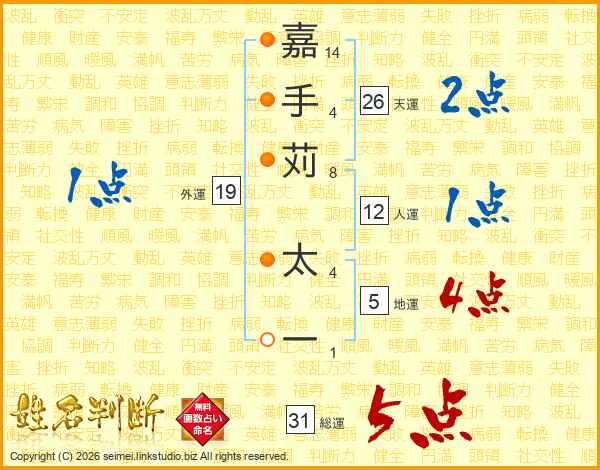 嘉(14画)手(4画)苅(8画) 太(4画)一(1画)