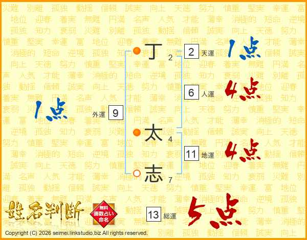 あなたの人生を表す1番重要な運勢です。生涯を通じて影響する総合運となり、主に50歳以降の晩年期に影響を及ぼします。苗字と名前の合計画数。
