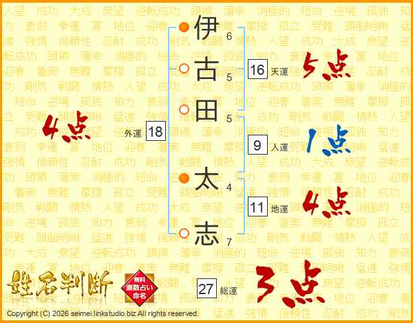 伊(6画)古(5画)田(5画) 太(4画)志(7画)