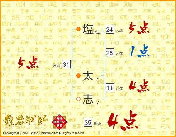 あなたの人生を表す1番重要な運勢です。生涯を通じて影響する総合運となり、主に50歳以降の晩年期に影響を及ぼします。苗字と名前の合計画数。