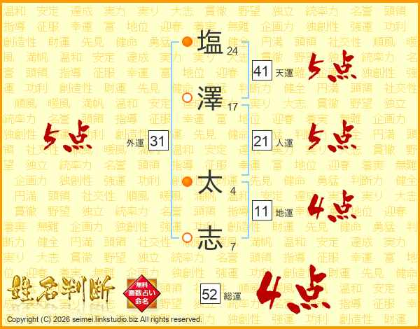 塩(24画)澤(17画) 太(4画)志(7画)