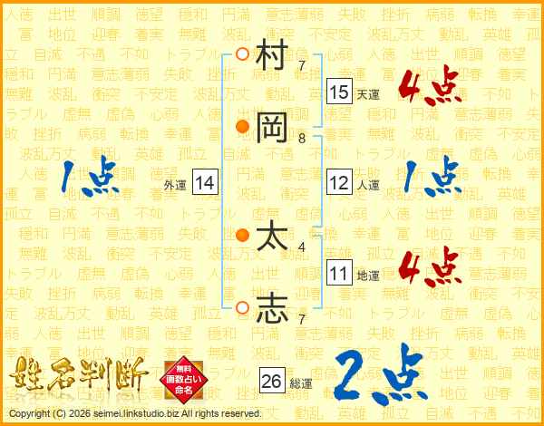 あなたの人生を表す1番重要な運勢です。生涯を通じて影響する総合運となり、主に50歳以降の晩年期に影響を及ぼします。苗字と名前の合計画数。