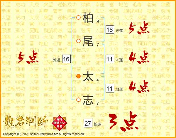 あなたの人生を表す1番重要な運勢です。生涯を通じて影響する総合運となり、主に50歳以降の晩年期に影響を及ぼします。苗字と名前の合計画数。