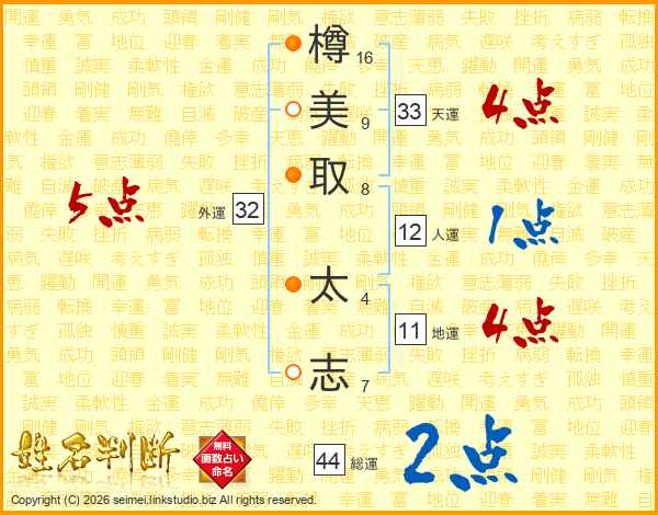 樽(16画)美(9画)取(8画) 太(4画)志(7画)