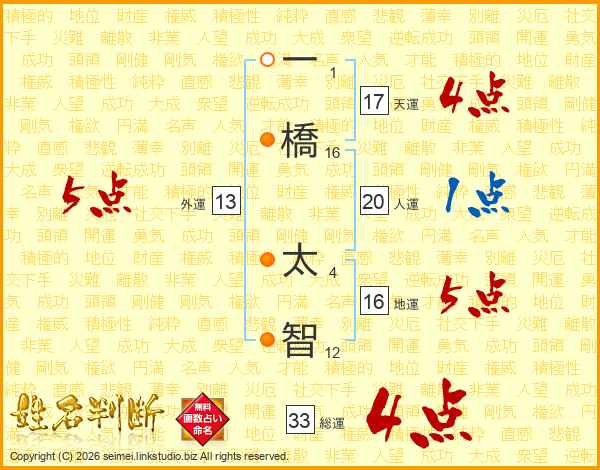 一(1画)橋(16画) 太(4画)智(12画)