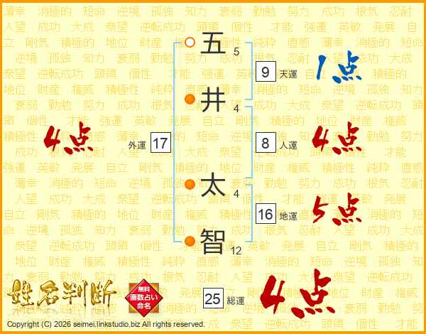 生活面を象徴する運勢です。外部から受ける影響力を表し、結婚運、家庭運や職場、環境への順応性を表します。総運から人運を引いた画数。姓や名が1文字の場合を除く。