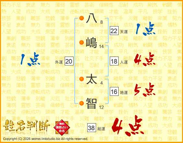 生活面を象徴する運勢です。外部から受ける影響力を表し、結婚運、家庭運や職場、環境への順応性を表します。総運から人運を引いた画数。姓や名が1文字の場合を除く。