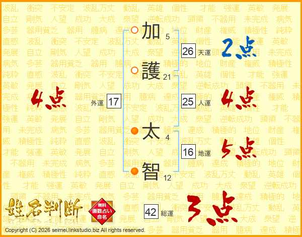 生活面を象徴する運勢です。外部から受ける影響力を表し、結婚運、家庭運や職場、環境への順応性を表します。総運から人運を引いた画数。姓や名が1文字の場合を除く。
