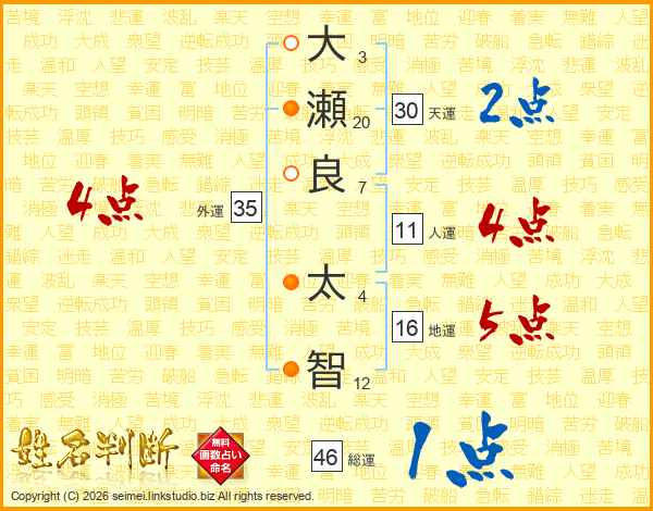 大(3画)瀬(20画)良(7画) 太(4画)智(12画)