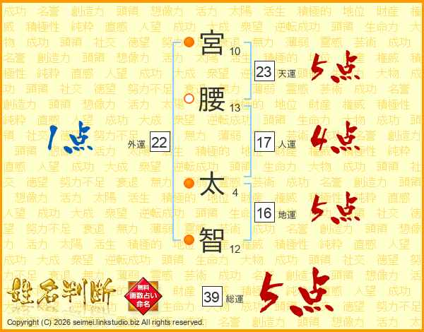 宮腰太智さんの総運は39画の5点!