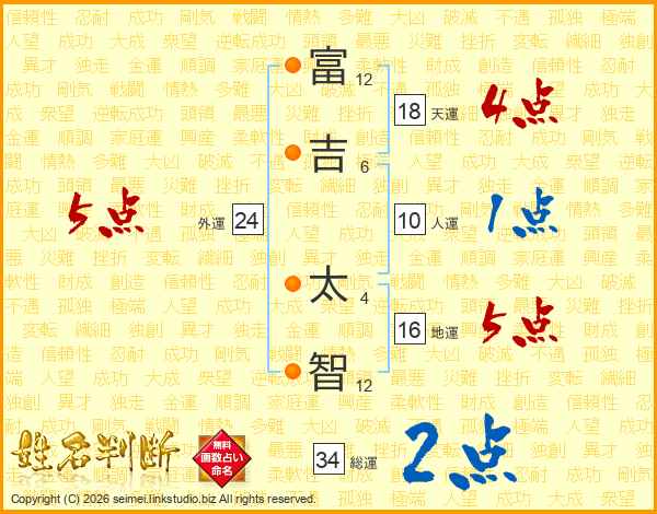 あなたの人生を表す1番重要な運勢です。生涯を通じて影響する総合運となり、主に50歳以降の晩年期に影響を及ぼします。苗字と名前の合計画数。