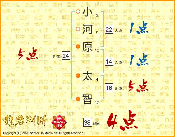 小河原太智さんの総運は38画の4点!