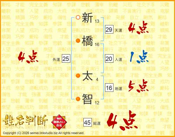あなたの人生を表す1番重要な運勢です。生涯を通じて影響する総合運となり、主に50歳以降の晩年期に影響を及ぼします。苗字と名前の合計画数。
