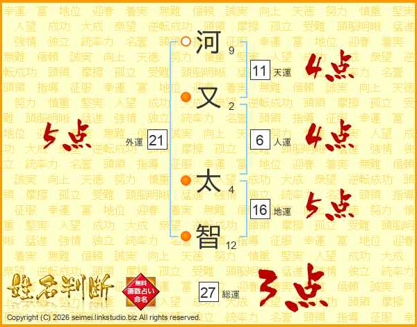 河(9画)又(2画) 太(4画)智(12画)