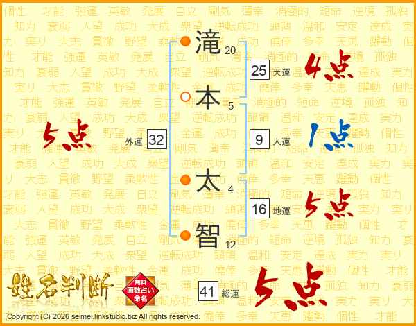 滝(20画)本(5画) 太(4画)智(12画)