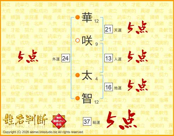 あなたの人生を表す1番重要な運勢です。生涯を通じて影響する総合運となり、主に50歳以降の晩年期に影響を及ぼします。苗字と名前の合計画数。
