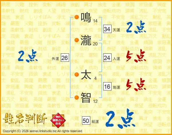 鳴(14画)瀧(20画) 太(4画)智(12画)
