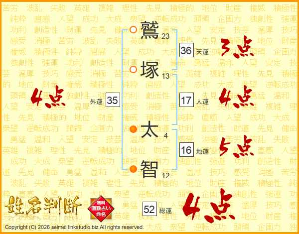 鷲(23画)塚(13画) 太(4画)智(12画)