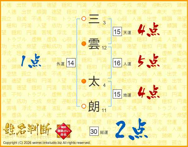 三(3画)雲(12画) 太(4画)朗(11画)