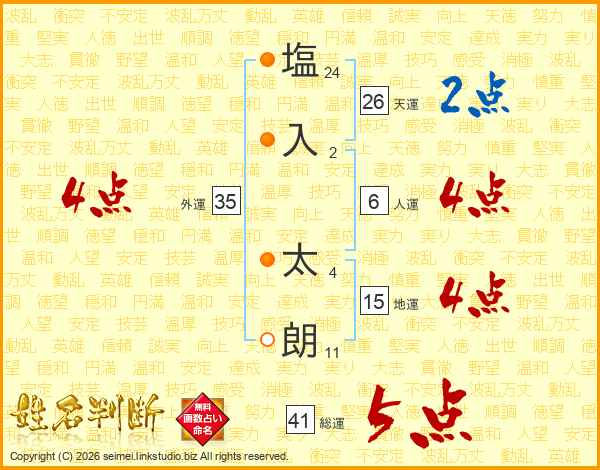 塩(24画)入(2画) 太(4画)朗(11画)