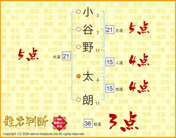 小(3画)谷(7画)野(11画) 太(4画)朗(11画)