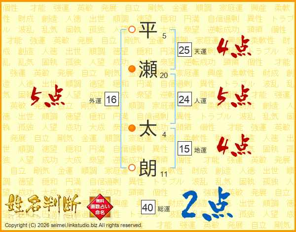 平(5画)瀬(20画) 太(4画)朗(11画)