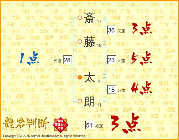 斎(17画)藤(19画) 太(4画)朗(11画)