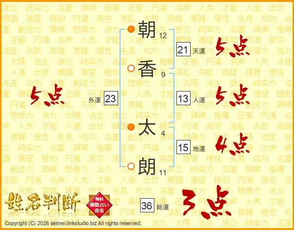朝(12画)香(9画) 太(4画)朗(11画)