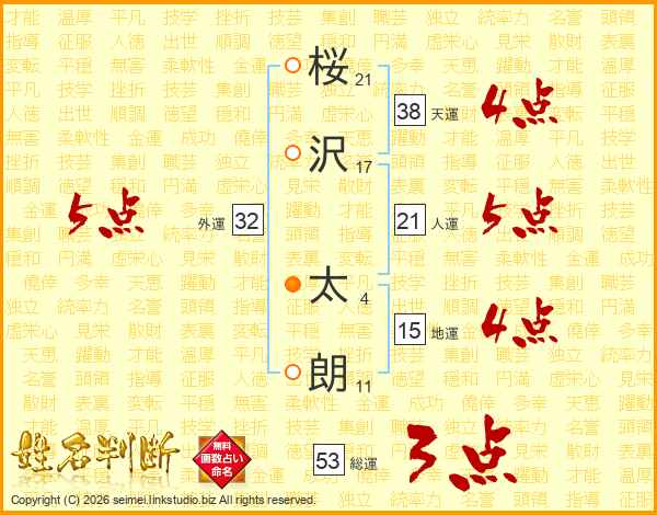 桜(21画)沢(17画) 太(4画)朗(11画)