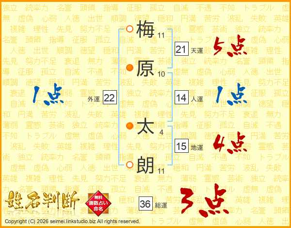 梅(11画)原(10画) 太(4画)朗(11画)